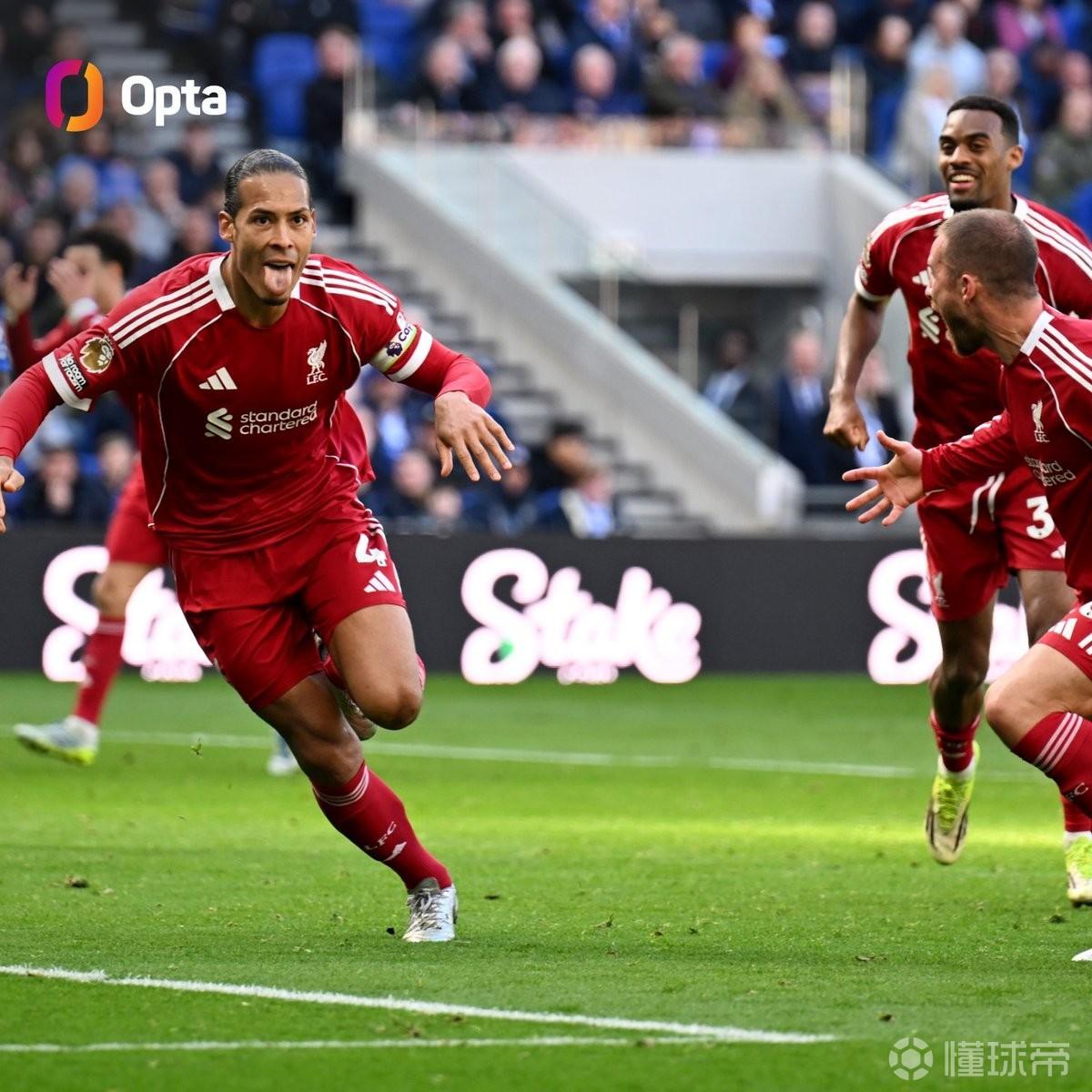 此役客场对阵埃弗顿,范戴克在比赛第100分钟打入制胜球,帮助利物浦2-1绝杀对手。